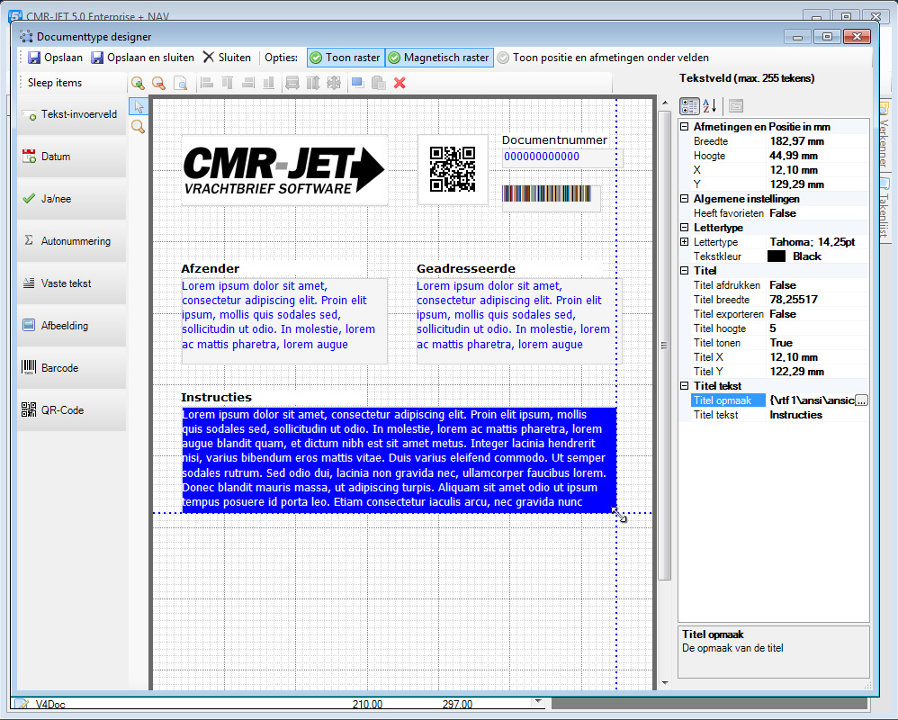Ontwerp bedrijfs-eigen documenten met verschillende veldtypes zoals tekstveld, datum etc.